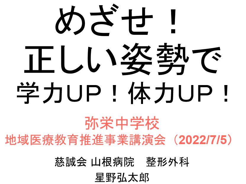 | 2022/7/5講演(島根県浜田市) 浜田市立弥栄中学校にて、昨年に続いて2回目の訪問で1年生8名に向けて、子どもたちの正しい姿勢をテーマに講演させていただきました。本テーマでの講演は、2017年から16回目になります。毎回バージョンアップして、よい姿勢のための4つの体操、勉強に大切な“勉強体力”、なぜ勉強しないといけないのか、ドクターにどうやってなったのか、など楽しくお話しさせていただきました。 |
