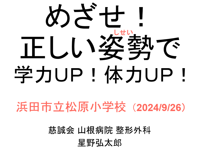 | 2024/10/3講演(島根県浜田市) 浜田市立今福小学校にて、3~6年生23名に向けて、子どもたちの正しい姿勢をテーマに講演させていただきました。本テーマでの講演は、2017年から23回目で、本校は2回目の訪問になります。毎回バージョンアップして、よい姿勢のための4つの体操、子どもの体と整形外科の病気について、ドクターのなり方、夢をもって勉強してもらうための知識など楽しくお話しさせていただきました。生徒のみなさん、目をキラキラさせて一生懸命聞いてくれてうれしかったです。アンケートにて「楽しらないことがわかってよかった」が20人でした! |