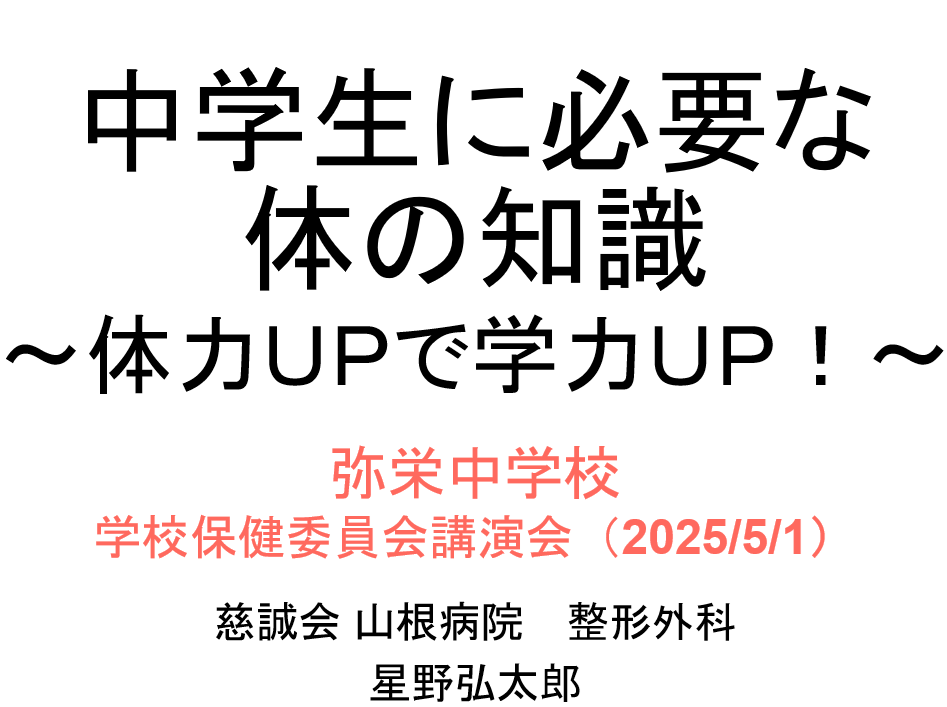 | 2025/5/1講演(島根県浜田市) 浜田市立弥栄中学校にて、子どもたちの体を守るテーマで講演させていただきました。本テーマでの講演は、2017年から24回目になります。毎回バージョンアップして、よい姿勢のための4つの体操、子どもの体と整形外科の病気について、ドクターのなり方、夢をもって勉強してもらうための知識など楽しくお話しさせていただきました。生徒のみなさん、目をキラキラさせて一生懸命聞いてくれてうれしかったです。15人という少数精鋭でしたが、アンケートにて14人が医療に興味を持ってくれたことがわかりうれしかったです。 |