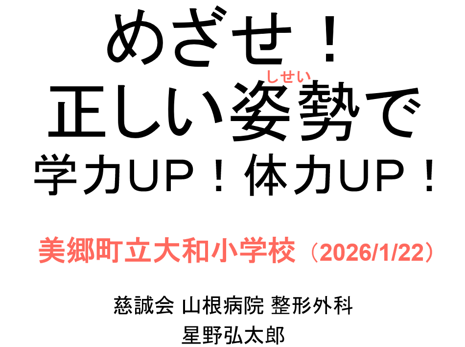 | 2026/1/22講演(島根県美郷町) 美郷町立大和小学校にて、全校生徒51人に向けて、子どもたちの体を守るテーマで講演させていただきました。2024年の養護教諭の夏期研修会での私の講演を聞いてくれた先生からの依頼でした。本テーマでの講演は、2017年から29回目になります。よい姿勢のための4つの体操、子どもの体と整形外科の病気について、ドクターのなり方、夢をもって勉強してもらうための知識などお話ししました。とても元気がよく、手もドンドンあげてくれて、とっても盛り上がって楽しかったですね!一所懸命聞いてくれてありがとうございました! |