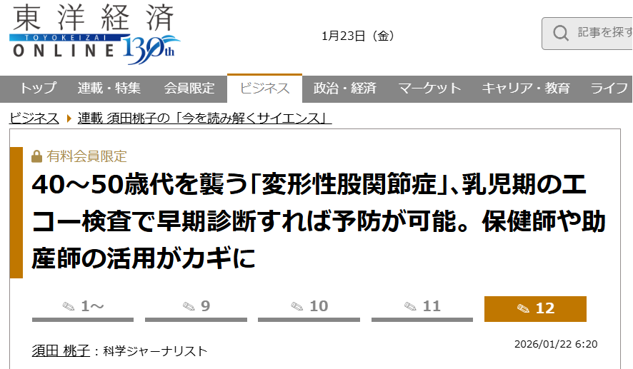 東洋経済オンライン「須田桃子の今を読み解くサイエンス」2026/1/22 『40〜50歳代を襲う「変形性股関節症」、乳児期のエコー検査で早期診断すれば予防が可能。保健師や助産師の活⽤がカギに』 第36回日本小児整形外科学会学術集会のシンポジウム「DDH の早期スクリーニング・診断と早期治療を考える」を取材に来ていただいた科学ジャーナリスト・須田桃子さんが、記事にまとめてくれました。私の発表した世界の動向、日本の課題についても取り上げていただき感謝します。有料会員でしか読めない記事ですが、一部読めますのでご紹介します。 |