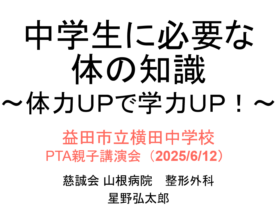 | 2025/6/12講演(島根県益田市) 益田市立横田中学校にて、全校生徒94人に向けて、子どもたちの体を守るテーマで講演させていただきました。本テーマでの講演は、2017年から25回目になります。毎回バージョンアップして、よい姿勢のための4つの体操、子どもの体と整形外科の病気について、ドクターのなり方、夢をもって勉強してもらうための知識など楽しくお話しさせていただきました。生徒のみなさん、ちょっとした成長をゲットしたポイントで、大きな拍手をありがとうございました!感想アンケートが届きました!メンタル的に最もしんどいかもしれない中学生、あきらめずに前を向くためのコツも紹介しましたが、感動させられる長文の感想がたくさん!これからもがんばります。 |
