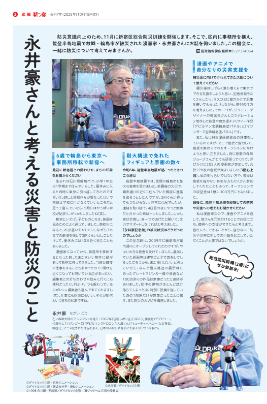 ●豪ちゃん輪島視察 われらが豪ちゃんは6月30日、地震後初めて輪島市内を訪れ、朝市通りの火災で全焼した記念館の跡地を視察しました。そして輪島塗で額装された永井さんの代表作、マジンガーZなどの作品11点が市に寄贈されました。贈られた作品は、今後、市役所や観光関連施設などに展示されるそうです。 NHK 石川 NEWS WEB(2025/6/30) テレ金ニュースNNN(2025/6/30) | ||