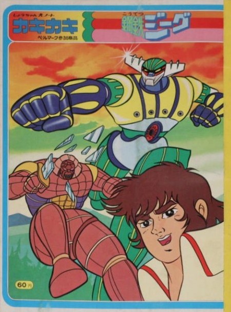 「鋼鉄ジーグ」A4判 ひろしがクルッっと丸くなって,ジーグの顔になっちゃうムチャさかげんは,ゲッターの合体に通じるダイナミックな魅力だぜ!変身過程が描かれたカラーイラストはあんまりなくって,この表紙はたまらないっすねぇ。 |