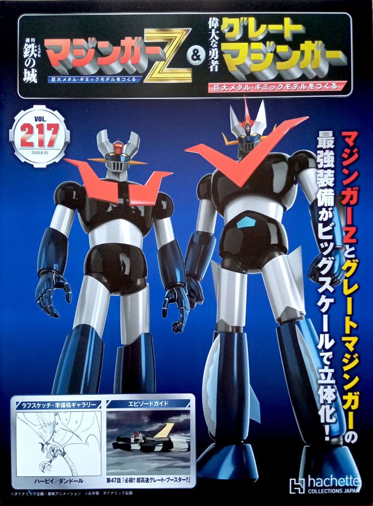 通巻VOL.217 組み立てガイド「台座の組み立て(9)」2p ラフスケッチ・準備稿ギャラリー「ハーピイ/ダンドール」1p エピソードガイド「第47話 必殺!! 超高速グレート・ブースター!!」2p |