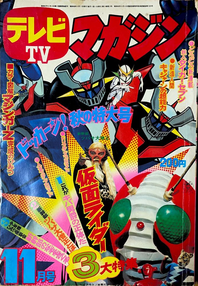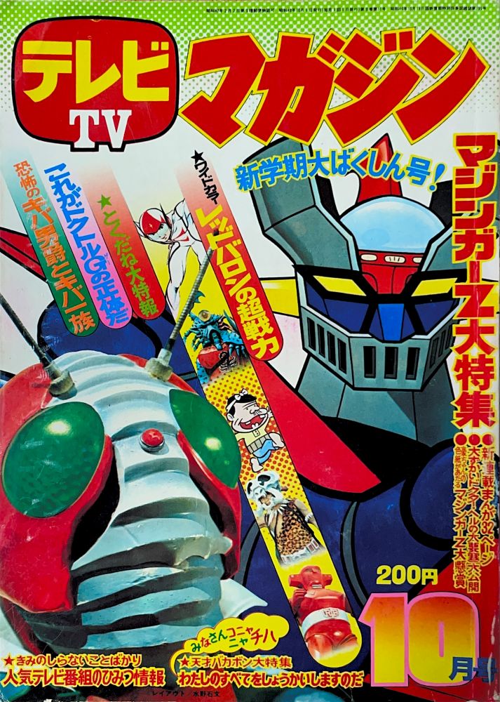 特 集「10月新番組 新ヒーロー歌のアルバム」マジンガーZ、キューティーハニー、ドロロンえん魔くん カラー図解「マジンガーZ完成のひみつ」4色5p 特 集「マジンガーZパイロットテスト 100の質問」18p(扉4色) 特 集「ボスののるロボットデザイン大発表!」4色1p マンガ「マジンガーZ」24p(扉4色)/機械鳥獣グレート=バードン,機械獣ウーラアP9 マンガ「キューティーハニー(岡崎優)」14p/ファイヤー=クロー |