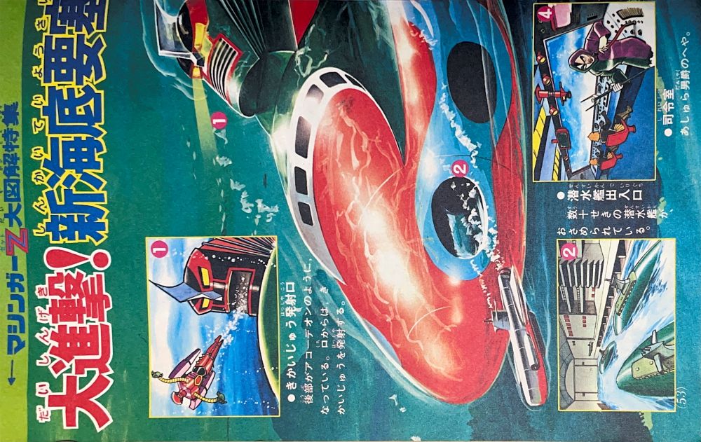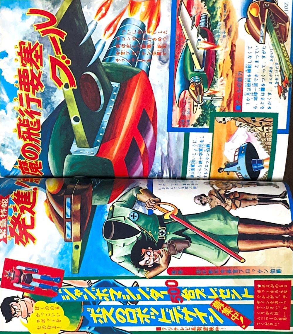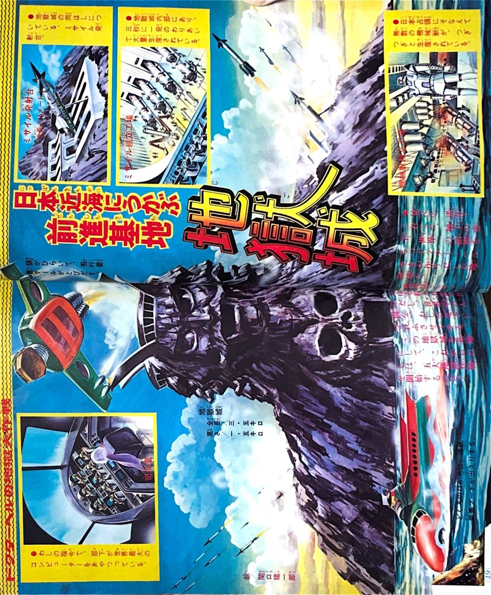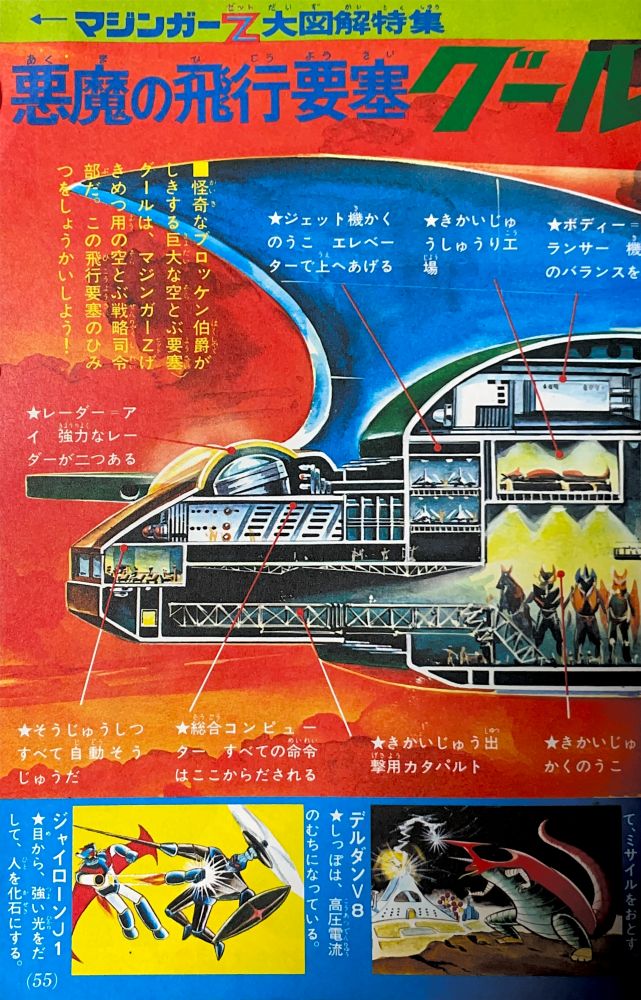 特 集 4色5p マジンガーZ大図解特集 ドクター=ヘルの2大要塞大公開!(表紙1p) 大進撃!新海底要塞ブード!(2p) 悪魔の飛行要 グールのひみつ 大図解(2p) 構成/ダイナミックプロ,絵/関口猪一郎 |