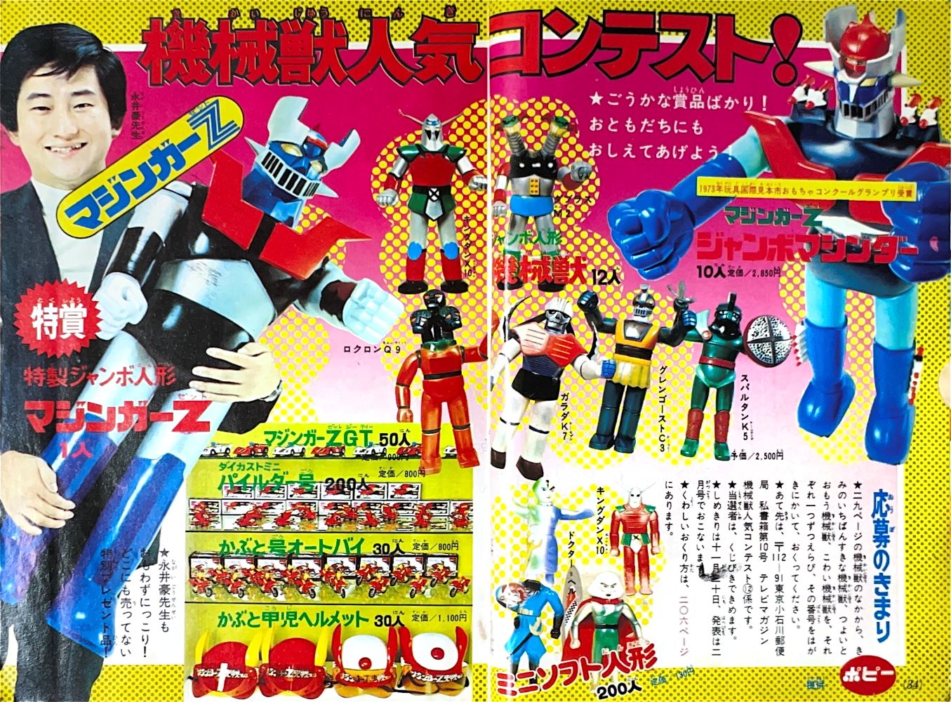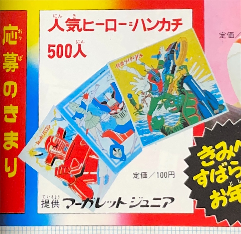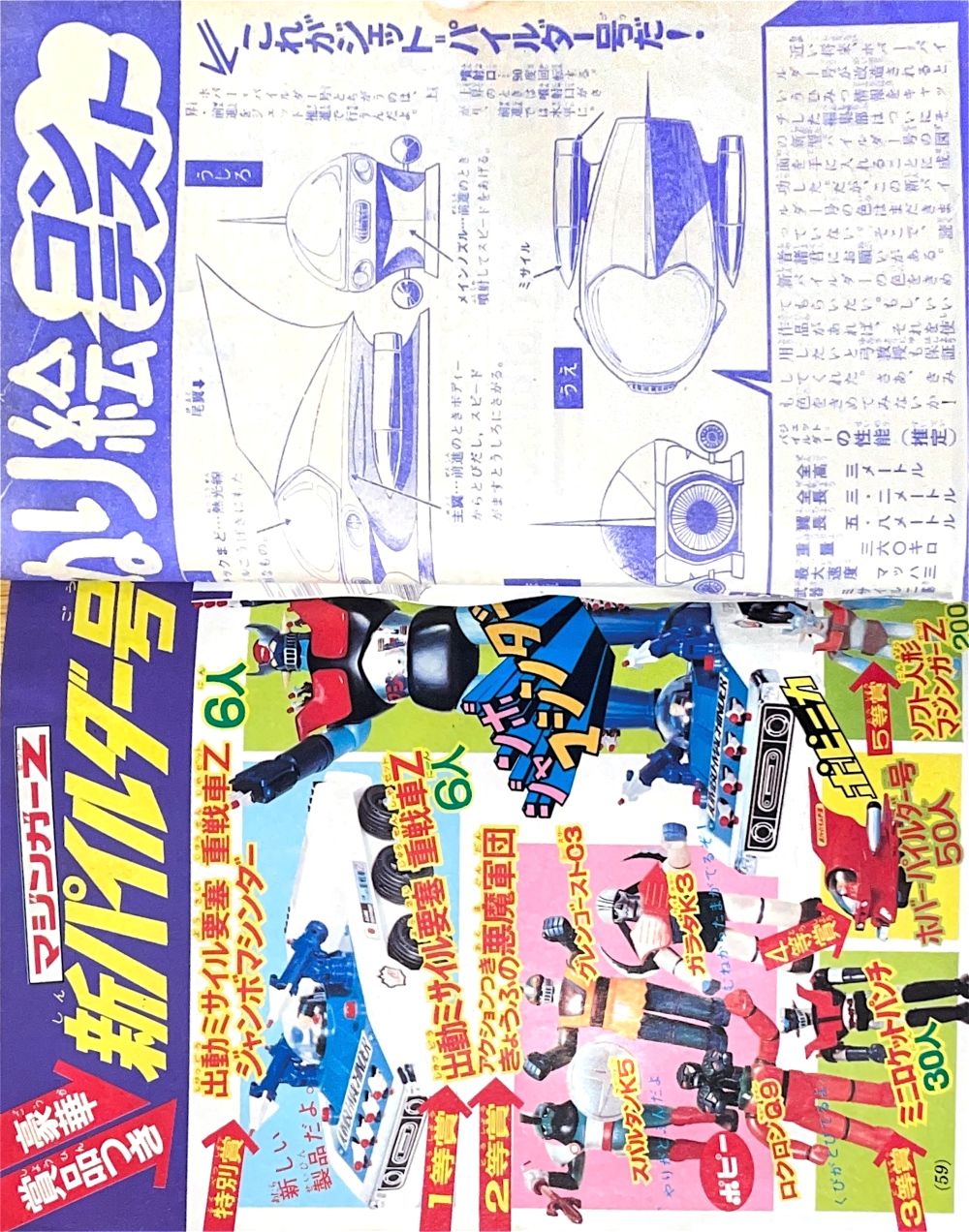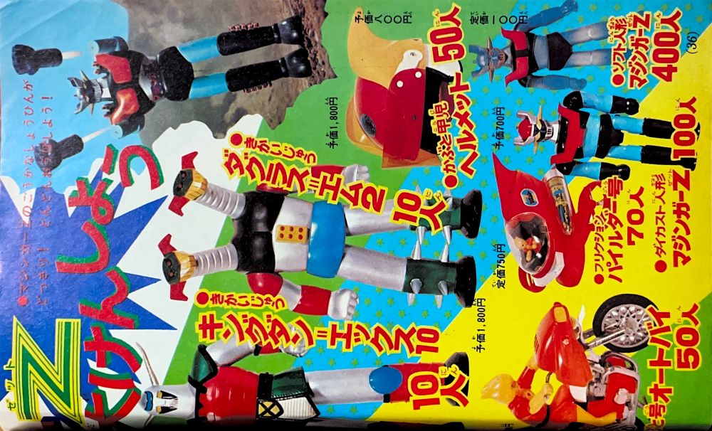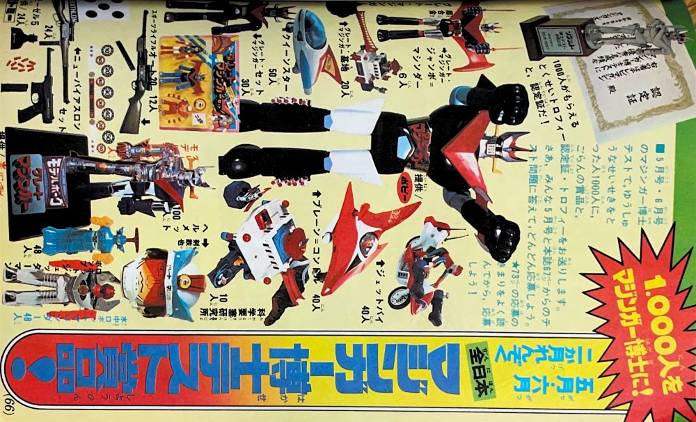 懸 賞「マジンガーZ新連載記念とくべつ懸賞」 永井先生色紙3人、ジャンボマシンダー7人、 ヘルメット20人、フリクションパイルダー号30人、 ダイカスト人形マジンガーZ50人 ソフト人形マジンガーZ100人 |