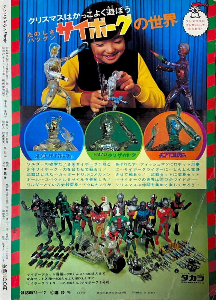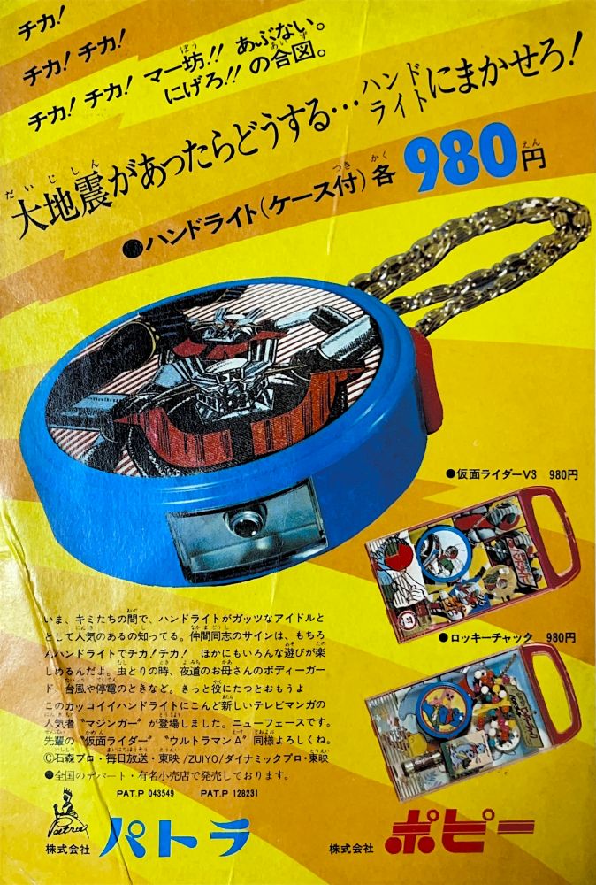 次号予告 新年もうれつ特大号 4色2p+白黒2p 広告 パトラ・ポピー「ハンドライト」宣伝ページが仮面ライダーV3からマジンガーZへ交代! 広告 タカラ「変身サイボーグ」数々のラインナップ勢ぞろいの一番端にマジンガーZ登場! |