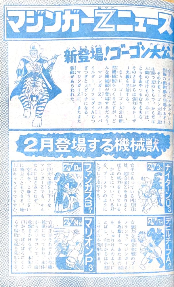 マジンガーZニュース 1p「新登場!ゴーゴン大公!」「2月登場する機械獣」 記 事「キューティー=ハニーのハロー!かっこいい男の子」6p 告 知「豪華賞品つき新パイルダー号ぬり絵コンテスト」2p(4色1p) 広 告「アオシマのプラスチックモデル ドロロンえん魔くん」4色1p |