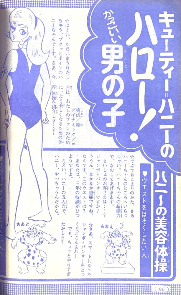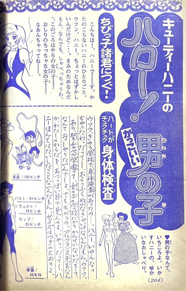 ふろく「お年玉クイズ絵はがき」欠 ふろく「マジンガーZ決戦トランプ」欠 特 集「マジンガーZ決戦大画報」(関口猪一郎)4色6p 特 集「ハニー!ハニー!キューティーハニー!」4色2p 記 事「キューティーハニーのハロー!かっこいい男の子」4p ハニーの身長は153cm,体重48kg,3サイズはB84/W49/H85だった! マジンガーZニュース「マジンガーZがスキーで大滑降!?」2p マンガ「マジンガーZ」26p(扉4色)/機械獣あしゅら男爵 扉4色 マンガ「キューティーハニー」(岡崎優)10p/ジャンボ=パンサー登場! |