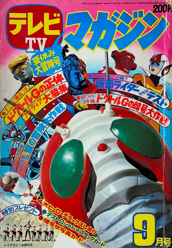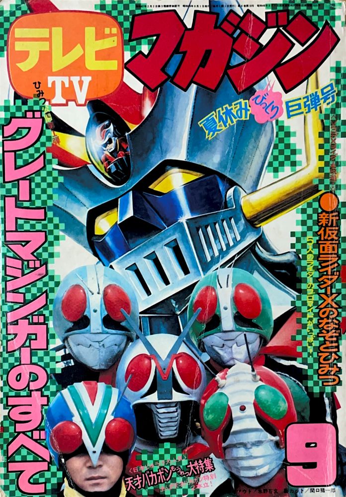 全プレ「グレートマジンガー・5人ライダーバッジ全員プレゼント」4色0.5p 特 集「グレートマジンガー完成記念ピンナップ」南村喬之 特 集「グレートマジンガーの超兵器ひみつ大図解」(4色8p)小林壇 特 集「ぼくの名は、剣鉄也」(4色1p)関口猪一郎 特 集「2大戦闘獣のもうれつ超兵器 ビラニアス・グラトニアス」(4色2p)南村喬之 マンガ「マジンガーZ」23p最終回/人型戦闘獣グラトニオス、魚類型戦闘獣ビラニアス 告 知 8月増刊号「マジンガーZ大百科」2p 広 告 パトラ「ハンドライト」「ソフトペンダント」(裏表紙) |