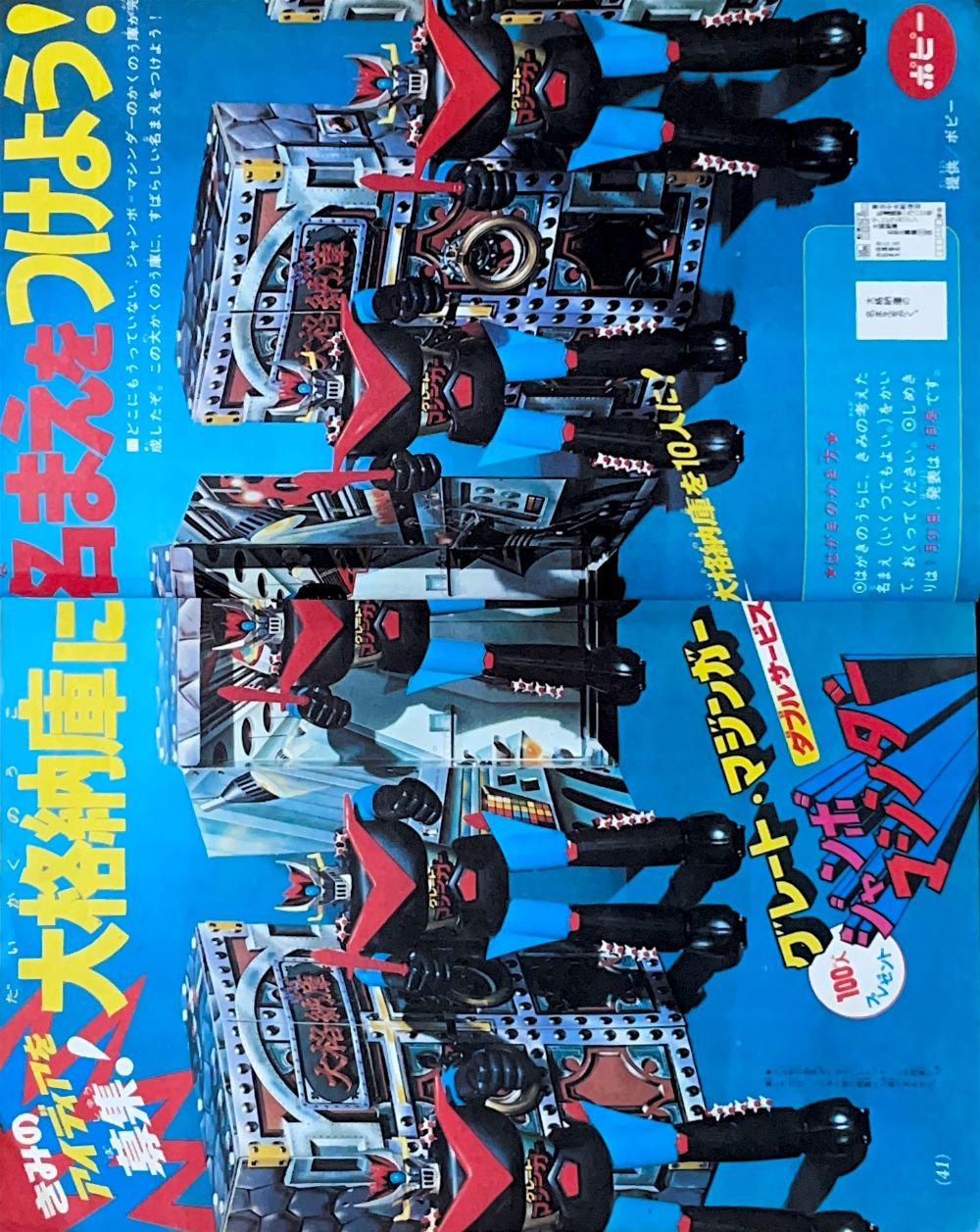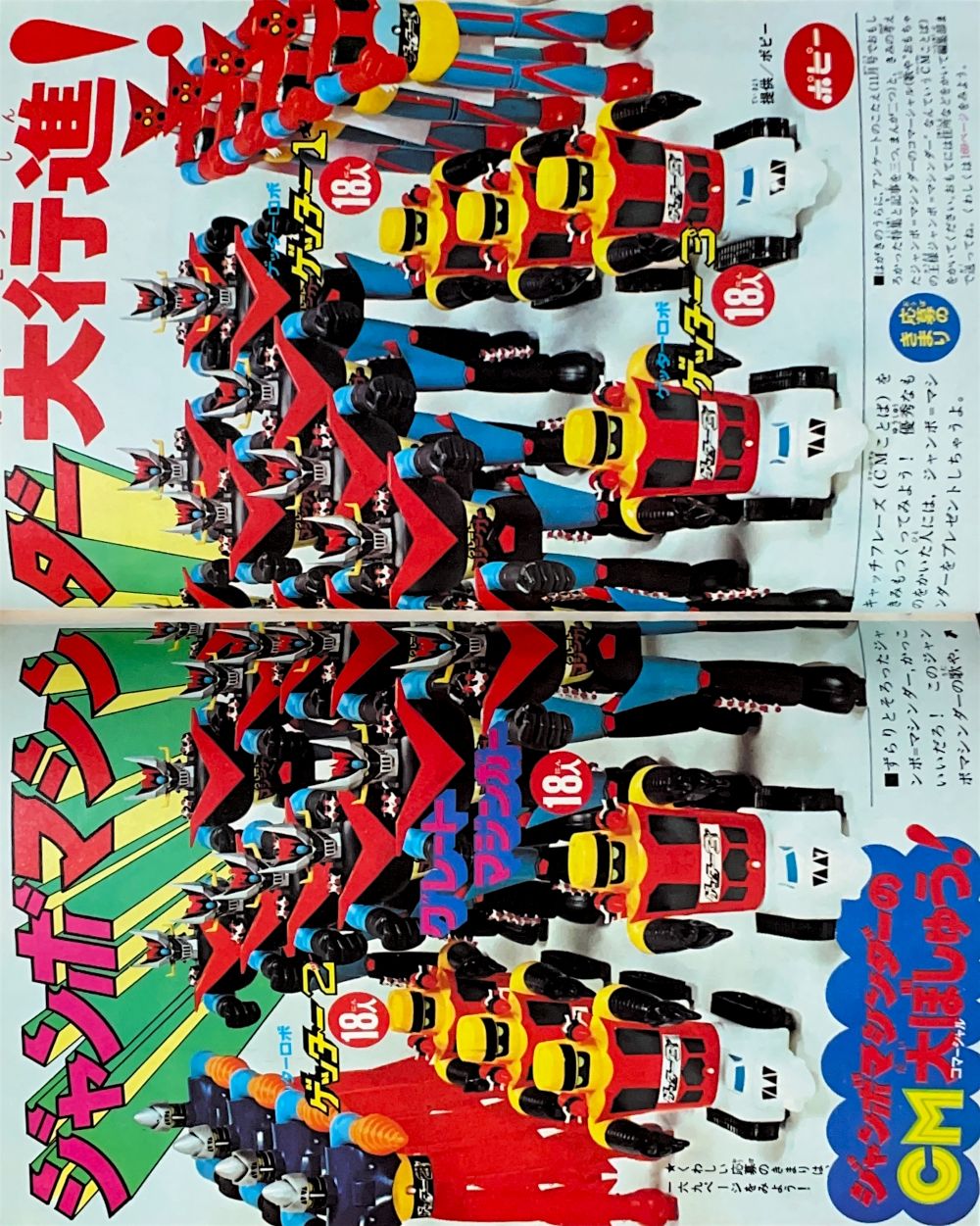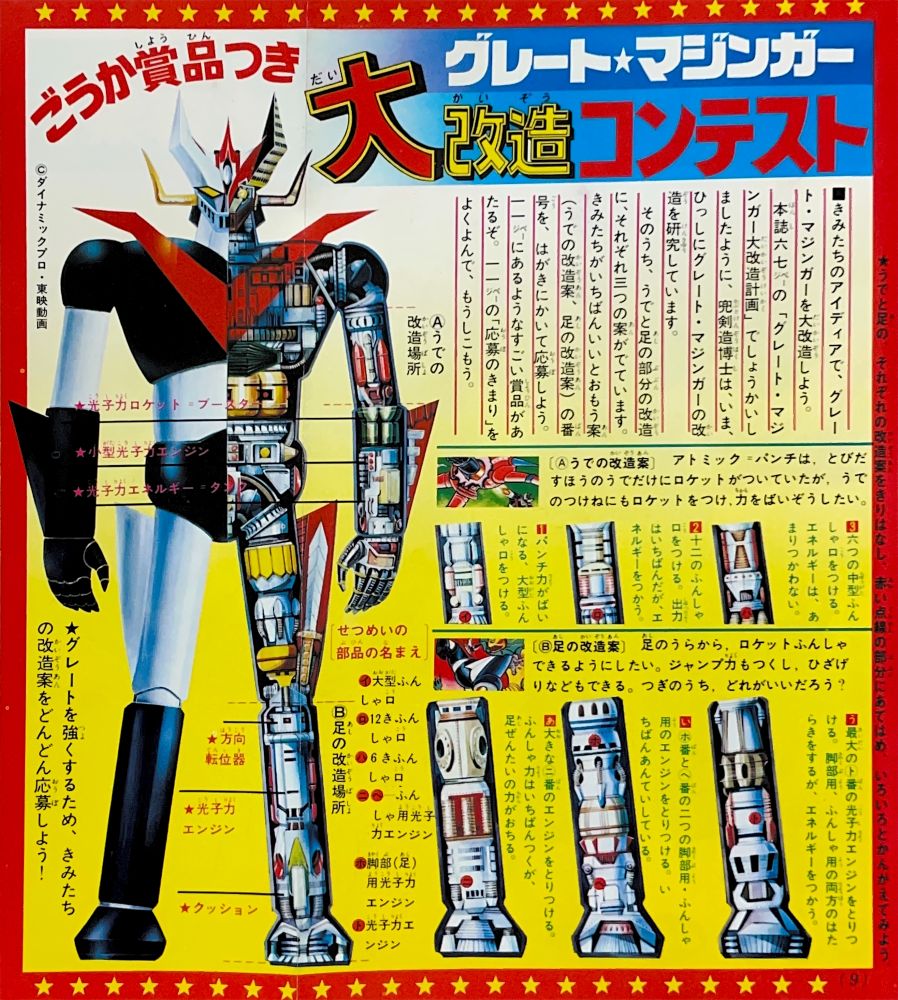 巻頭付録「甲児とさやかからの手紙」4色1p 巻頭付録「グレート・ゲッターカラー図解カード」4色4p グラビア「グレート・ゲッター記念アルバム」4色,「グレート・ゲッター体力・能力くらべ」2色 懸 賞 ポピー「超合金クイズ大会」4色8p 特 集「グレート・マジンガーのひみつ大百科」4色15p(南村喬之,関口猪一郎,小林壇) 特 集「全戦闘獣ひみつものしり百科」(成井紀郎)31p単色 記 事「きみはグレート派か?ゲッター派か?」(企画・構成/菊地忠昭)変形16p単色 マンガ「グレート・マジンガー対ゲッターロボ」(桜多吾作)94p(扉4色)/宇宙金属獣ギルギルガン登場! 広 告 バンダイ「グレート・マジンガー モデルボーグ」4色1p 広 告ポピー「超合金」「ポピニカシリーズ」裏表紙 |