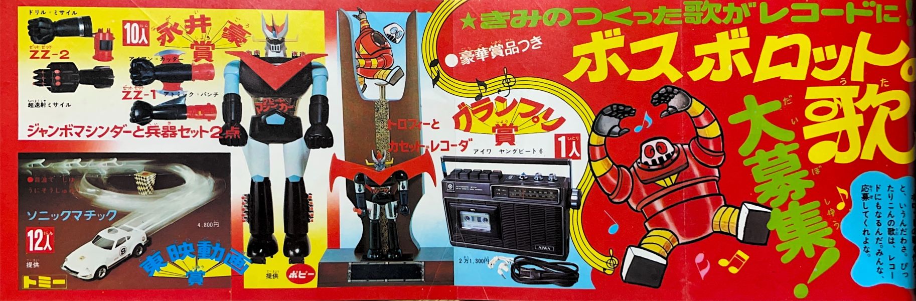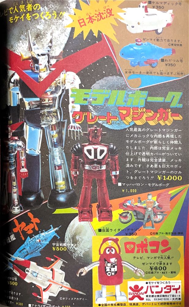 懸 賞「ボスボロットの歌大募集」 巻頭付録「人気ヒーロー立体ブロマイド」 特 集「グレート・マジンガーそうじゅうのひみつ」4色5p 特 集「戦闘獣カラー図鑑(6体)」4色4p マジンガーズクラブ「科学要塞研究所大公開!」(9p) マンガ「グレート★マジンガー」第2話17p/月夜に登場ビューナスA! マンガ「破裏拳ポリマー」新連載 絵/秋本シゲル 広 告 ポピー「ジャンボマシンダーのCM大募集」(4色2p) 広 告 ニッコー「グレートマジンガーのアトミックパンチ」 |