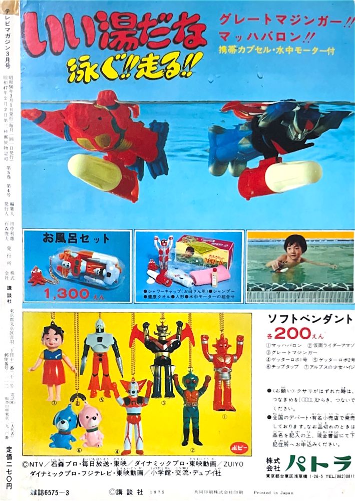 予 告 6月号のおしらせ「この超ヒーローはなにもの?」1p4色 広 告 バンダイ「モデルボーグ」グレートマジンガー,ゲッターロボ 4色1p 広 告 パトラ「お風呂セット 1300円」「ソフトペンダント 200円」グレートマジンガー,ゲッターロボ 裏表紙 |
