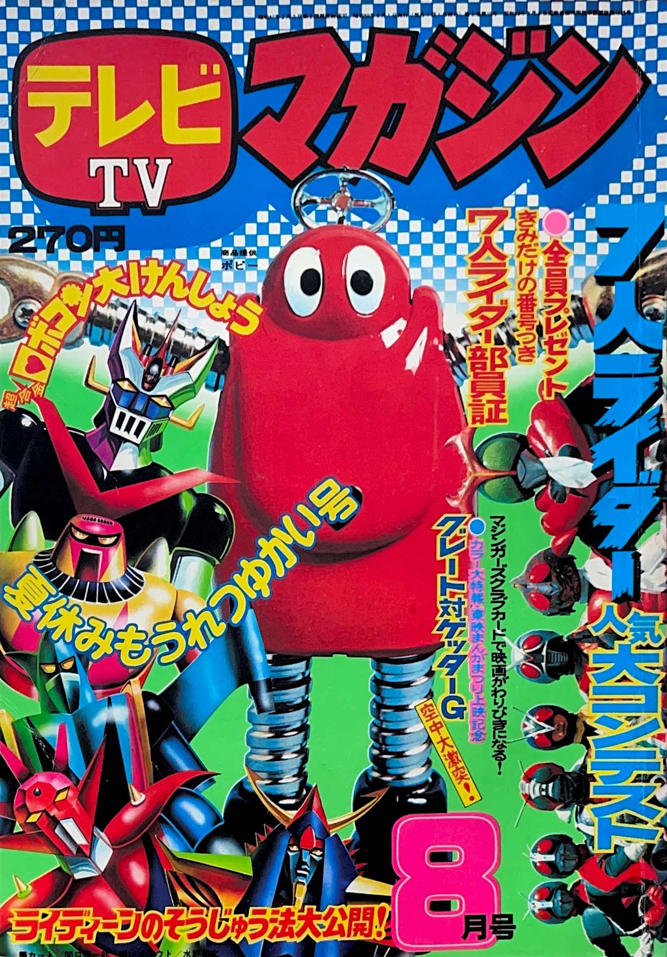 特 集「8月16日海底要塞サルード大爆発」4色2p 特 集「マジンガーZの四大空中殺法」4色2p 特 集「発進!悪魔の飛行要塞グール」4色2p マンガ 天才バカボン(赤塚不二夫),レッドバロン(野口竜) マンガ 仮面ライダーV3(すがやみつる)扉4色,レインボーマン(あだち充) マンガ ロボット刑事(土山よしき)扉4色,キャシャーン(秋本シゲル) マンガ 流星人間ゾーン(新宅よしみつ)完,バビル2世(松本めぐむ)完 |