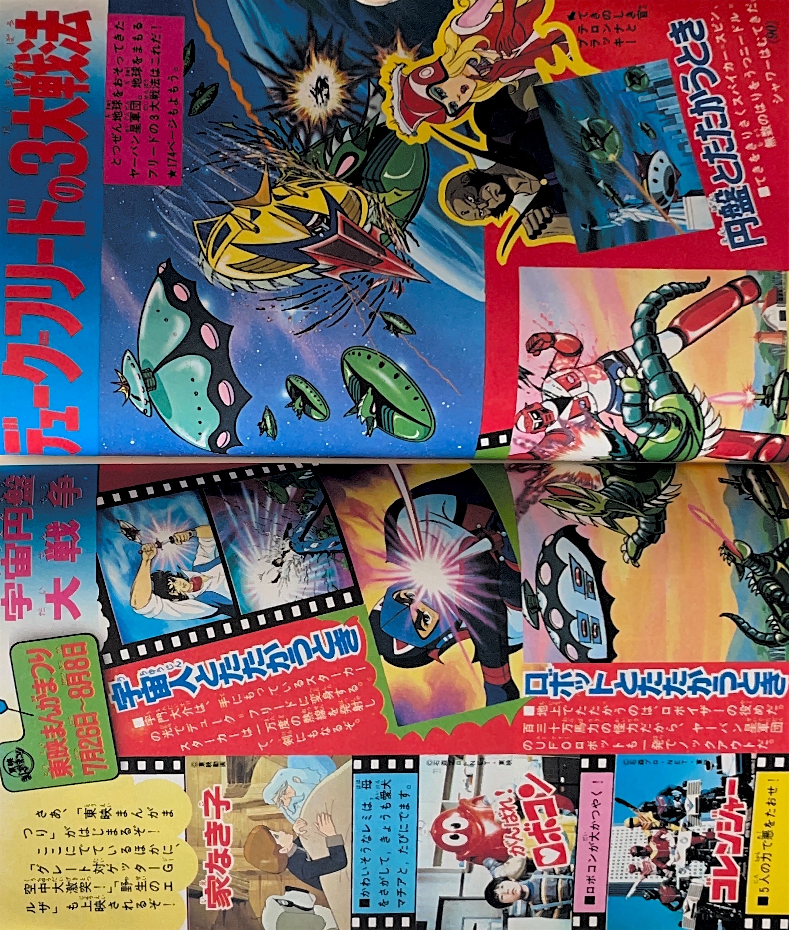 マンガ 「決戦!大海獣 グレンダイザー・ゲッターロボG・グレートマジンガー」桜多吾作94p(扉4色) 「ミクロマン」森藤よしひろ 「おなり〜っ ボロッ殿だい」真樹村正 「宇宙鉄人キョーダイン」成井紀郎 「元祖天才バカボン」赤塚不二夫 「超人ビビューン」やまと虹一 「ぐるぐるメダマン」芝しってる |