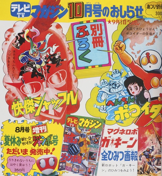 まんが豪版「グレート」17p 扉4色 まんが安田「ジーグ」26p 新連載・扉4色 特 集マジンガーファミリーゆめの大飛行(ピンナップ)小松崎茂 特 集地獄大元帥はおれにまかせろ!(9p4色)関口猪一郎・南村喬之 特 集マジンガー博士テスト(7p)関口猪一郎・南村喬之 マジンガーズクラブ「兜甲児がアメリカから帰ってきた!」(9p) ポピーのジャンボマシンダー大格納庫カラー宣伝 7月号の宇宙円盤大戦争の予告(1/2p4色,1/2p単色) マジンガー博士テストの豪華賞品カラー記事(1p) |