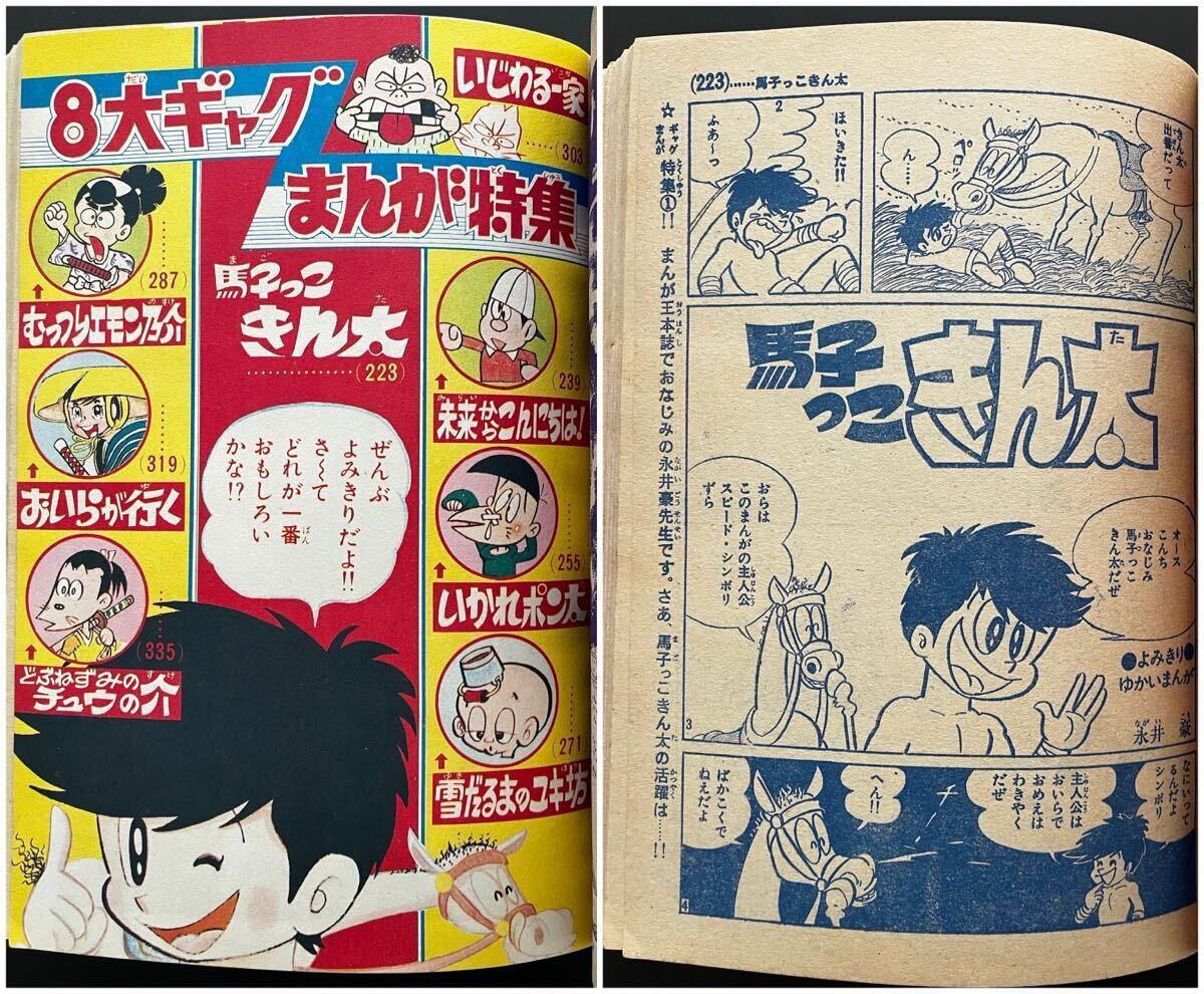 永井豪けっさくギャグまんが劇場 ●「馬子っこきん太」8p/無能ノ介登場!巻頭5p4色 ●「きまぐれ先生」26p(初出:りぼんコミック1969(S44)2月号) ●「ハナの三四郎」10p(初出:週刊少年マガジン増刊1968/2/4号) 巻頭グラビア カラー特別公開「恐怖の臓器移植」豪ちゃんイラスト5点あり。 折込 少年チャンピオン創刊告知(4色) |