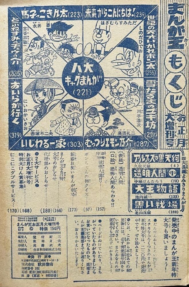 懸賞 サインプレゼント&懸賞問題にも! 告知 まんが王お正月大増刊号「キックちゃん」イラスト2点あり。 イラストから少年ブック1969(昭44)4月号ふろく掲載された「コイビトくん」と同じものと判明! |