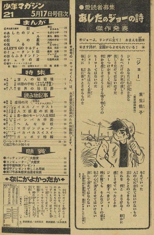 1970(昭45)#21(5/17)急病のため休載 ×1970(昭45)#21(5/17)「キッカイくん」掲載なし(目次と柱に活字のみのお知らせ)