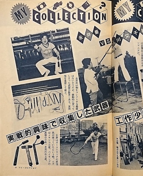川又氏は飛行機や船のプラモが好きだったが、壊れてしまうので、壊れないモデルガンにのめり込むようになった。今では百種以上保有するガンマニアだ。 永井氏は物をコレクトする趣味はないそうだが、衝動的に買ってしまった武器が数多くある。実用性を重視して選ぶ。 石斧はオーストラリアの原住民が使っていたという物。ムチはメキシコ土産。バイキングの武器は小池一夫氏のお土産。 ←見よ!この狂気の豪ちゃんを!! |